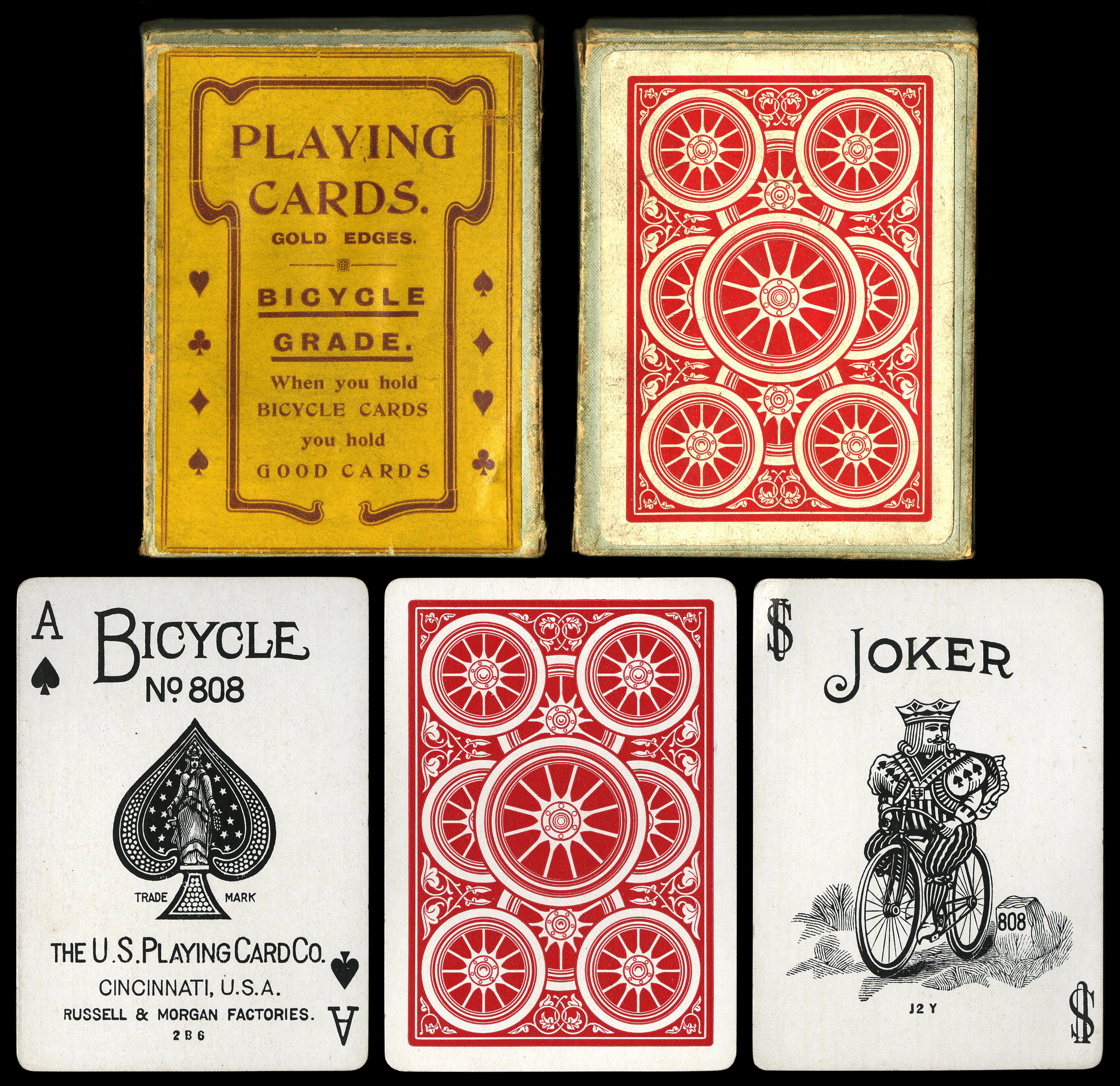 In 2025 I acquired a 1906 All Wheel deck from the UK, the first I have seen that was released in Britian. The box and cards are pictured below. As indicated on the box, this deck has beautiful gilded edges.